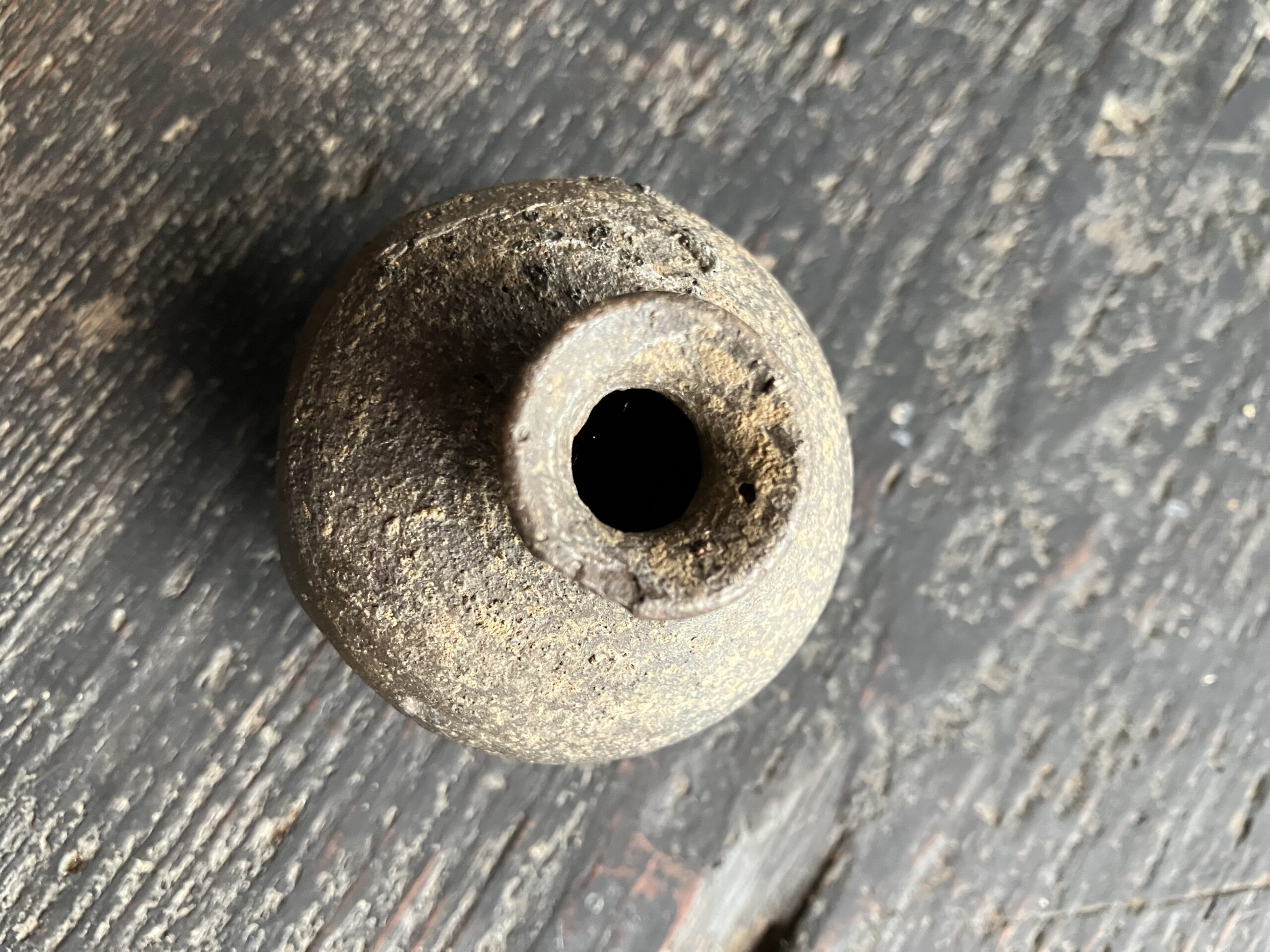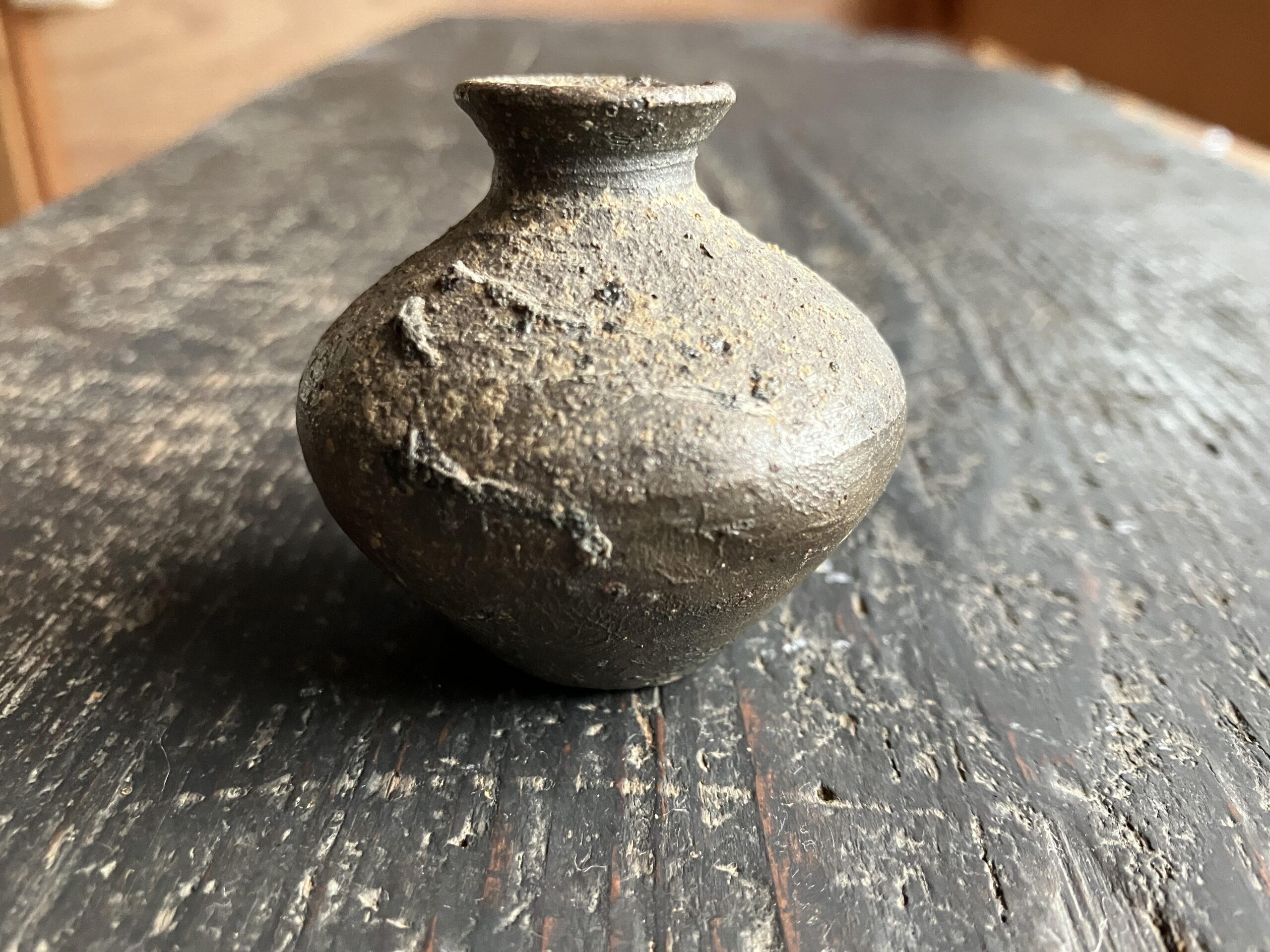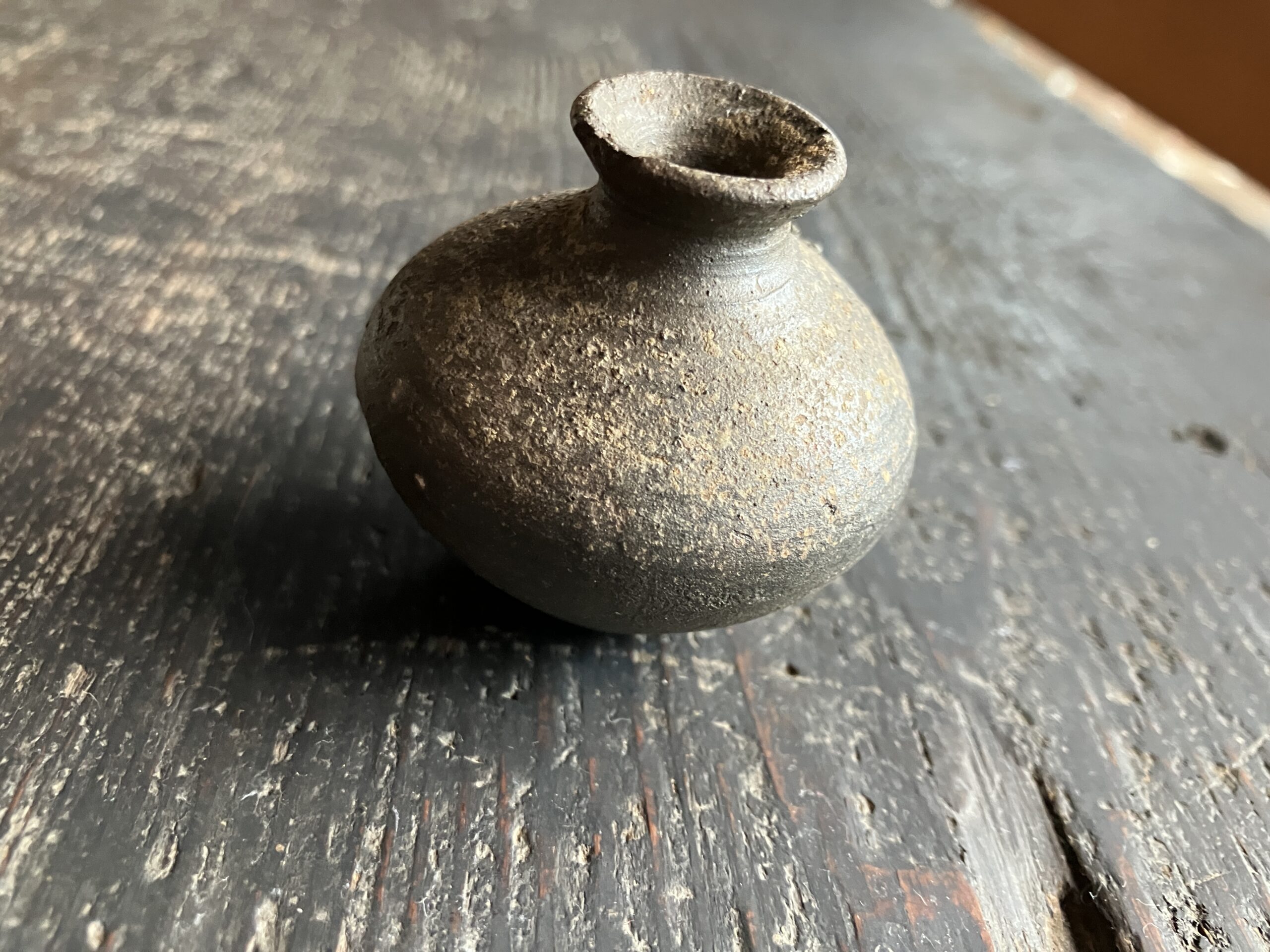 新羅土器は、紀元前後から朝鮮半島で展開した古代土器文化の系譜を継ぎ、統一新羅(7〜9世紀)の時代に宗教儀礼や祭祀で用いられたものが多く見られます。灰黒色の胎土により焼き締められ、質実でありながら洗練された造形美を持つのが特徴です。本作のような小壺は祭器や副葬品として用いられ、単なる日常器を超えて宗教的象徴性を帯びています。掌に収まる小形でありながら、時代を超えて伝わる存在感は、新羅文化の精神性と美意識を如実に示しています。